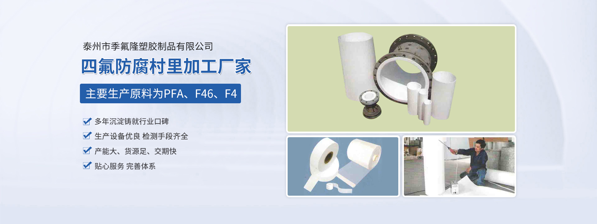 泰州市季氟隆塑膠制品有限公司(江蘇斯瑞沃爾科技發(fā)展有限公司)占地8000平方米,各類專用生產(chǎn)設備三十多合,現(xiàn)有員工近20人,其中技術人員10名,均多年從事該行業(yè)生產(chǎn),經(jīng)驗豐富。本公司主要生產(chǎn)原料為PFA、F46、F4,主要為電磁傳感器、防腐管道、各種容器反應釜三通四通彎頭及各種閥門等產(chǎn)品進行防腐村里加工,長期為德國、日本、美國、新加坡等國在華合資公司配套,產(chǎn)品廣泛應用于環(huán)保、油田、化工、造紙、冶金等行業(yè),產(chǎn)品質(zhì)量優(yōu)良,服務及時周到,一直深受顧客信賴。